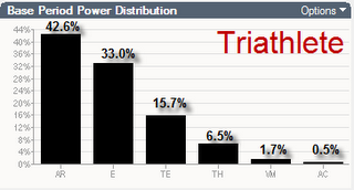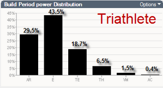 Here you see the bicycle power distributions by zones from the Base period for a competitive road cyclist and an Ironman triathlete. Each zone is labeled with its percentage of the total training time during te Base period. Both are very successful age-group athletes I coach and both Base charts are from their 2009 winter training. The power zones on these charts follow the Coggan system commonly used in WKO+ software. I’ve renamed the zones as follows: